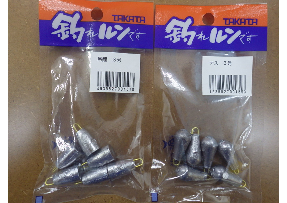 ナスオモリ、吊鐘オモリの特長といえば名のとおり、ナスのような形と吊鐘の形になっております。